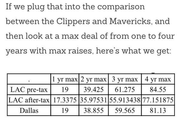 The reports from people who actually know him (read: not ESPN) were always that he was looking for a short term contract so that he could sign another deal, similar to what Lebron has done. Obviously with a true max deal (years and $$$) he'd make more. But, the final year or two is often player/team options and if you are past your prime then you aren't gonna get jack. Here's a graphic showing just how much money you lose playing in Cali vs Texas, with accurate numbers from people who understand the cap a hell of a lot better than I do-