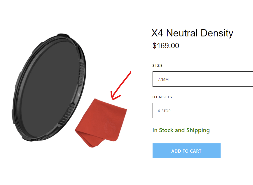 For the Neutral Density filter next to it, it comes with the cloth, just couldn't find that specific cloth on their accessories page but it's basically the exact same kind of weave just thicker/tighter, more absorbent than the Oakley bag microfiber material. (granted of course the Breakthrough filters use a metal deposit coating with a 25 year warranty, and would withstand a lot more than your typical lens).