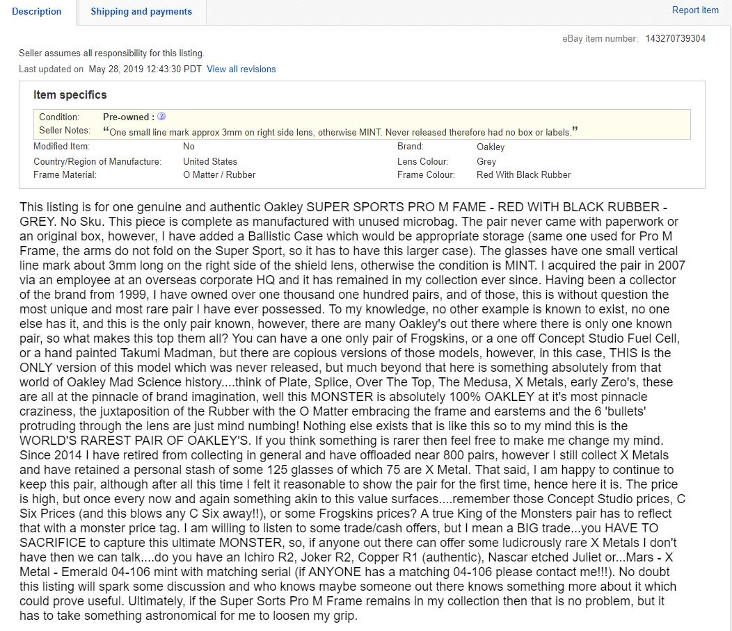 That's Romeo Van Frogskinstein a member here and he had some of the most amazing Oakley glasses ever. Also he has dropped the price to $6,337.00. I guess it can't hurt to ask.