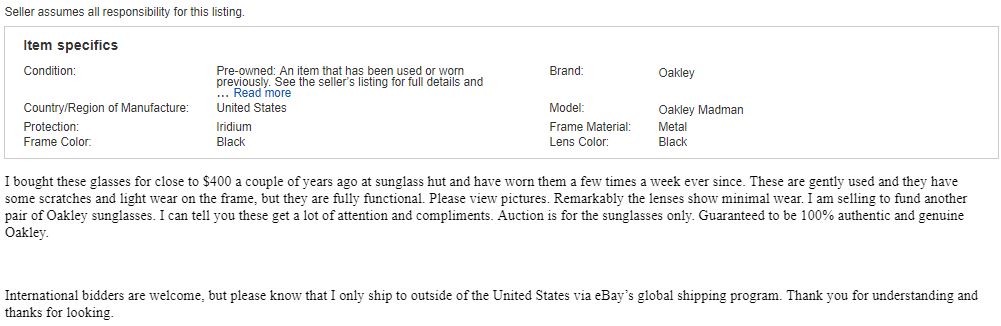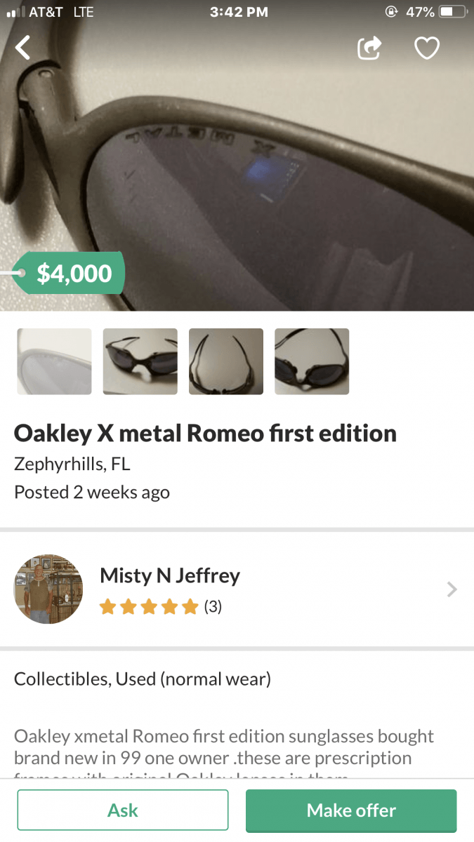 This one definitely takes the cake for me. I contacted the seller and asked if the price was a typo and he was actually asking $400. He claims he called Oakley and was told if he sold them he would get a minimum of $5000 and is adamant that he will sell them for 4000.