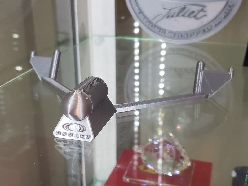 I was going to tinker with the 3D files already have which are based on existing Oakley stands but decided to create my own from scratch, but still hopefully still looks like something Oakley (or at least pre-Lux Oakley) would make. I drew some inspiration from the shape of the original Oakley metal stand rods, as well as the fact some of Oakley's older designs had a bit of para-military/industrial look to it (like missiles/bullets and all the riveting)