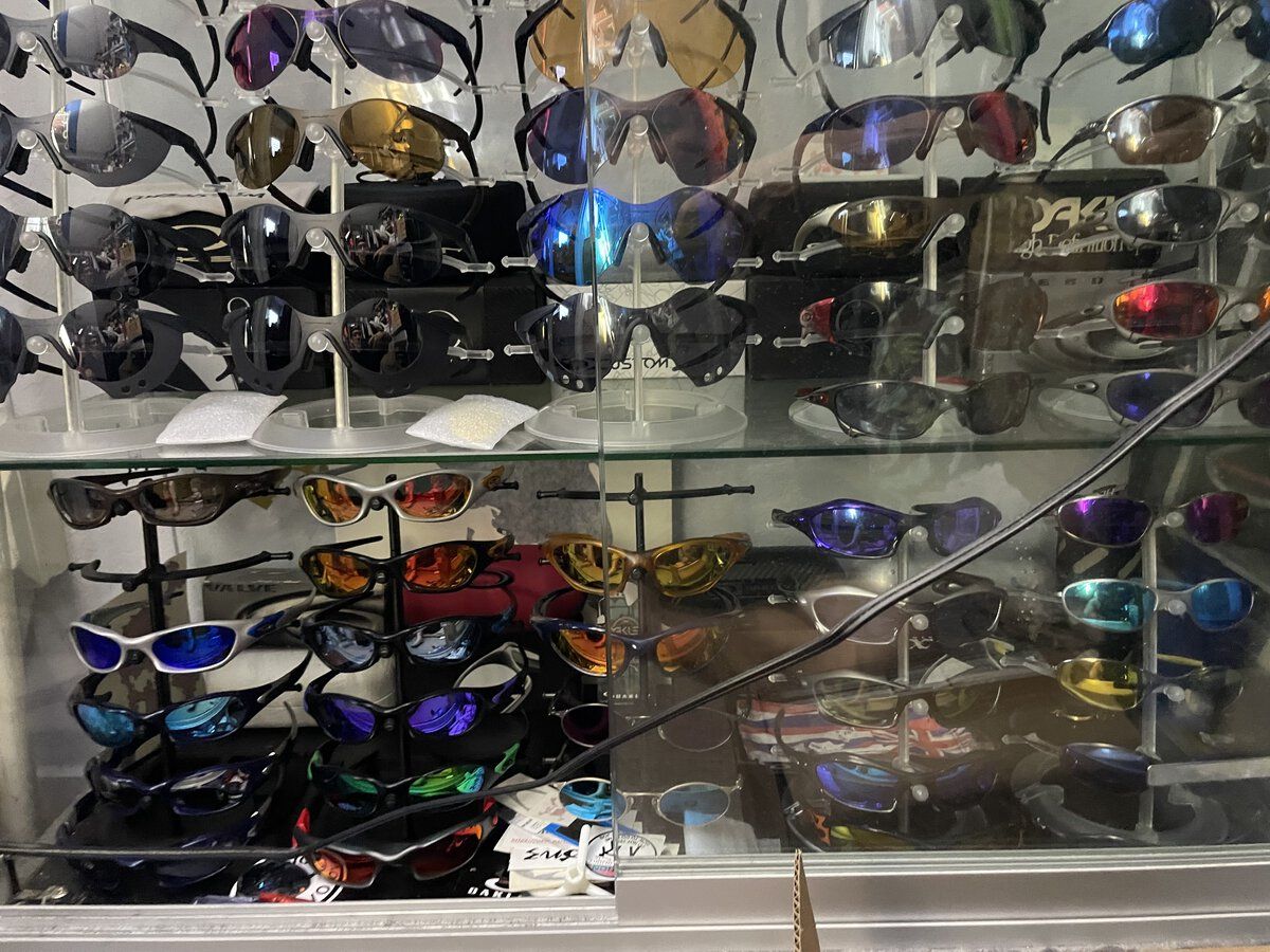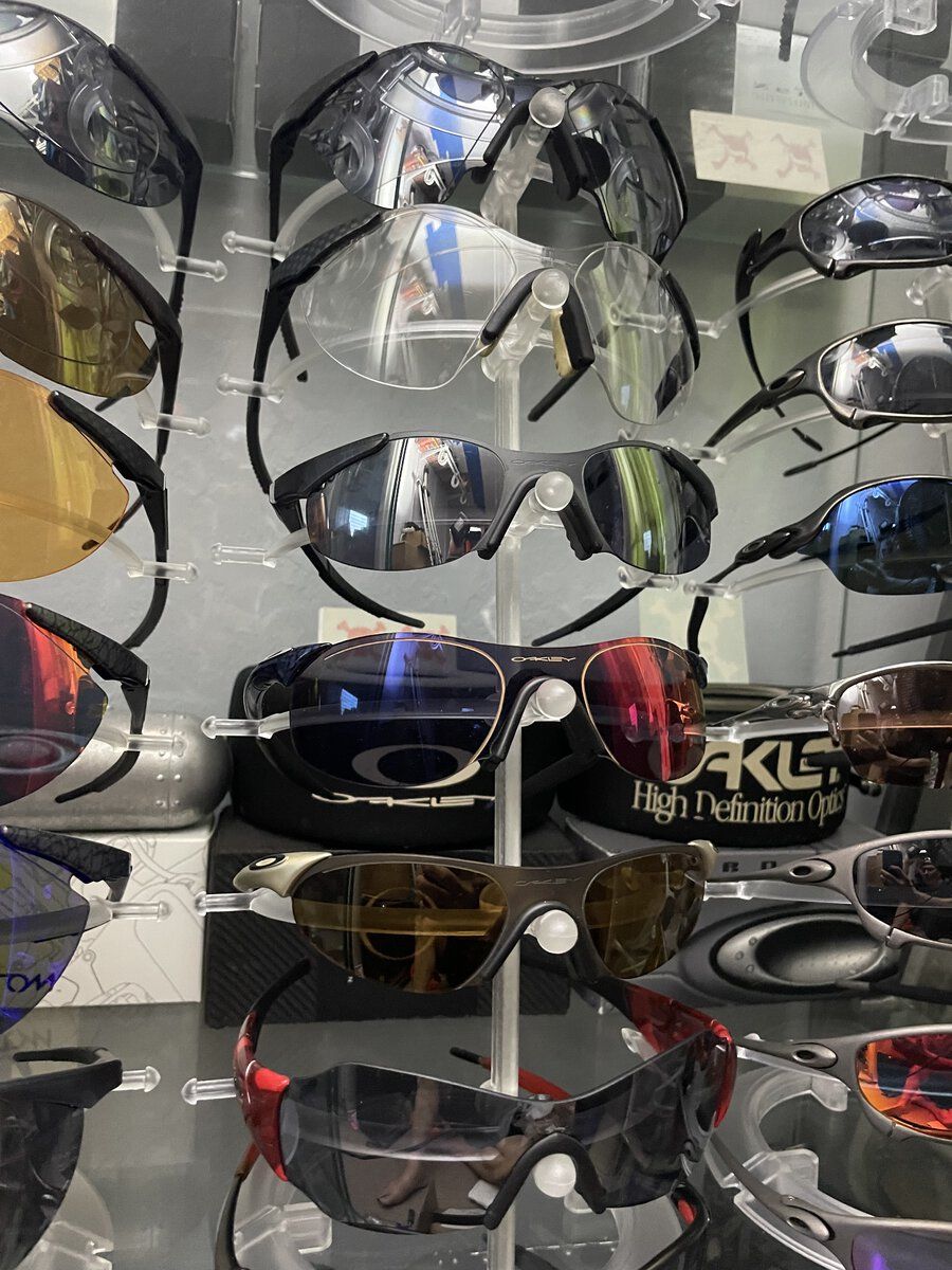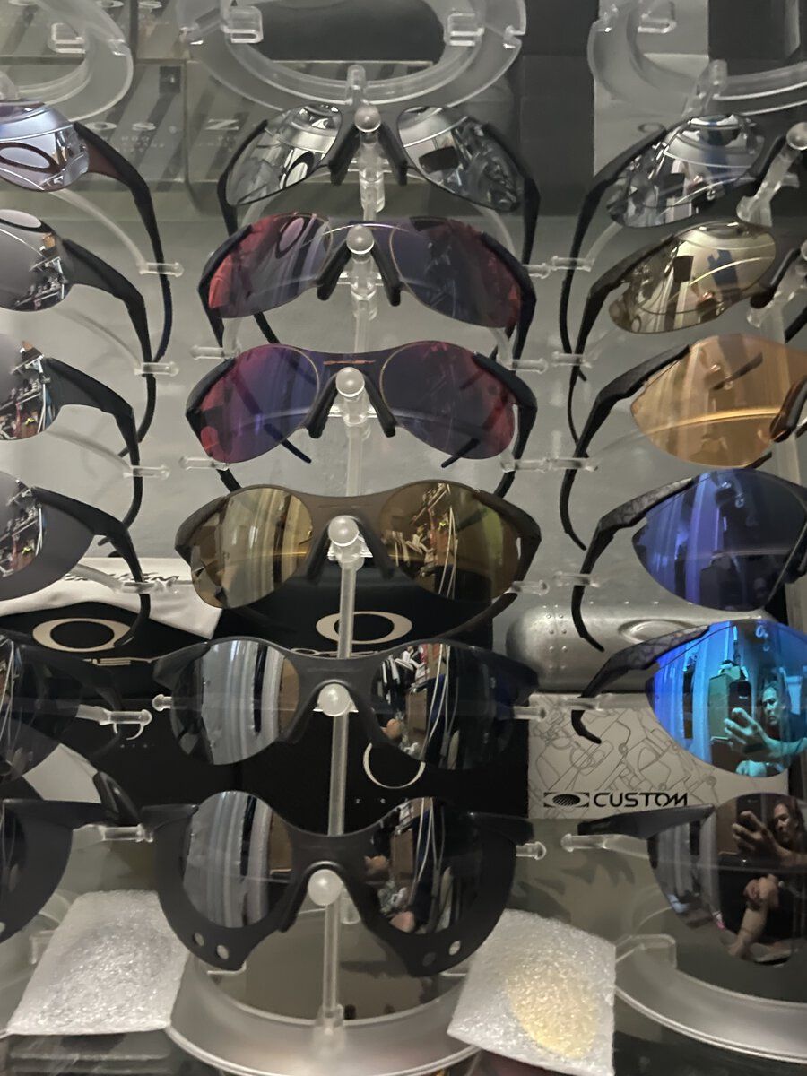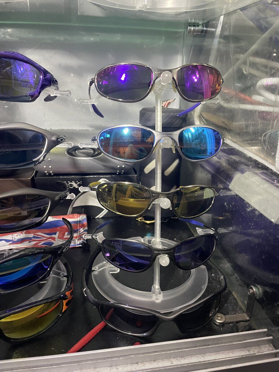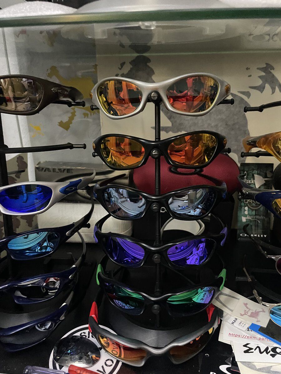 Mahalo for everyones nice comments, but I don't feel I have much of a collection actually. I certainly don't feel like an "Oakley Collector". I've seen the actual "collections" here. Rooms full of cabinet after cabinet, with all kinds of models. There are real "collections" out there that put what I got to shame. Sure I got a bunch of just a few models in particular. I really love my Mars and have a bunch of them. But all were bought with the idea of being worn at some time. And a lot of what I have was bought cheap and fixed up. So the thought of keeping things original doesn't even enter my mind. I don't mind the cheap colorful ear socks, as long as the lens quality is there. And I don't mind using aftermarket lenses. So not that kind of collector to keep everything Oakley. And I don't mind having custom one-of-a-kind-models, even if done myself. Especially if done myself actually. Lol. And I don't ever see myself ever buying things like bicycle grips. Or Christmas ornaments. And I only like certain watches, and that's all I'll buy, I believe the reason I've bought so many Mars, is because I am jealous of so many other peoples "Collections". I had to find one thing to hoard a lot of. so I have more than most people. @pjd1234 already cornered the Romeo1 market so I didn't go there. My top shelf.