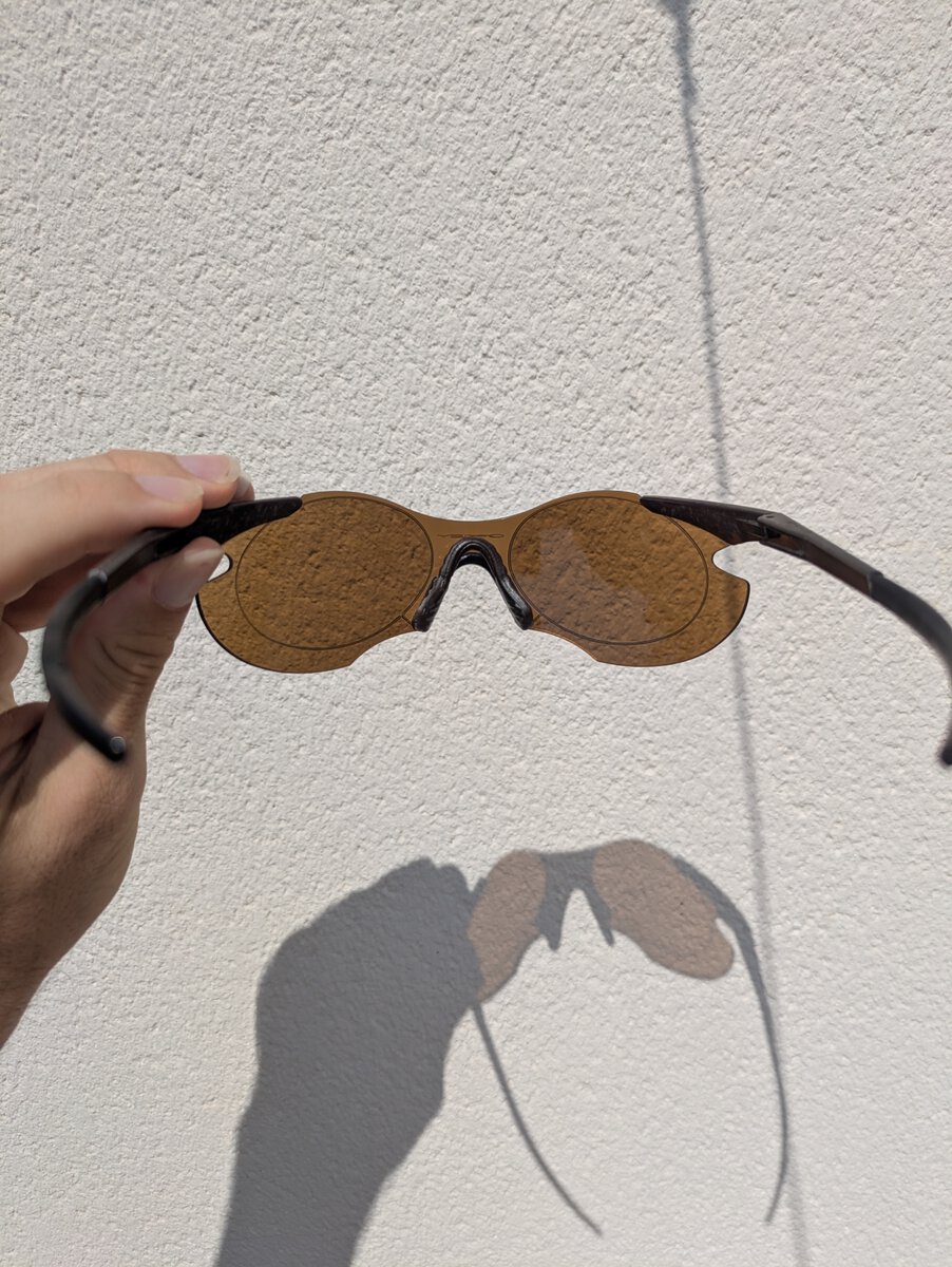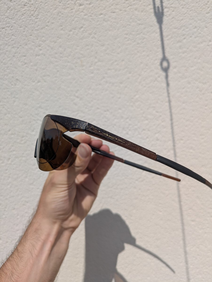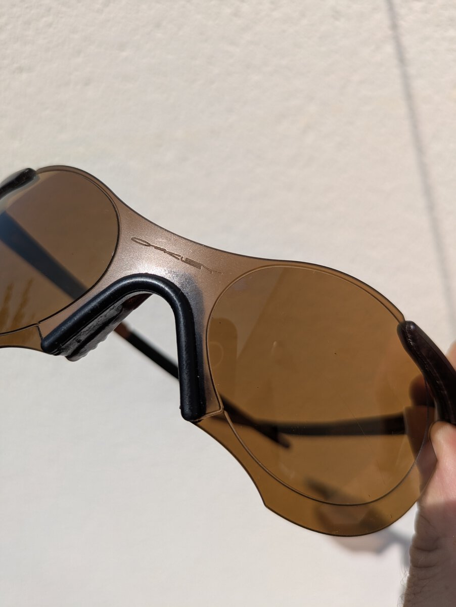 A Crystal black M Frame with a Black Iridium Heater Lens. Somewhat collectable but with a cracked frame, which is common on these crystal frames, much less so.Hi, I am new to the forum, I purchased these mirrored M frames in the US in the 90s. They have been worn, have all original parts and case, but looks like a small crack in frame. Only codes I can see US pat Nos 4,674,851 4,867,550.