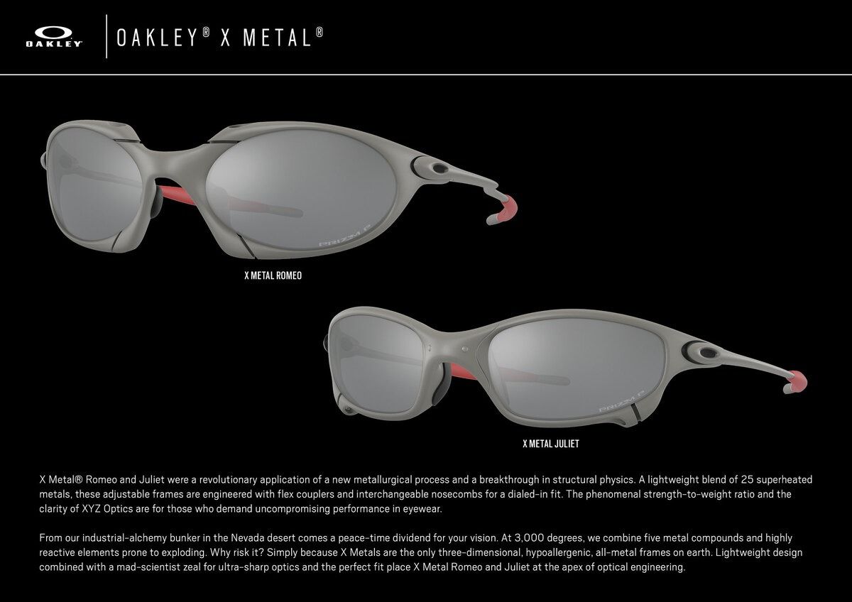 The imaginative and disruptive spirit of Oakley was marked by the release of a new design aesthetic that firmly launched the brand into the cultural mainstream in the ‘90s. The relentless drive to redefine the next generation of eyewear with unique, sculptural shapes led to the development of a never-before-seen wire design. The result was X Metal® Romeo and Juliet, the brand’s first sculptural wire frame glasses that were unmistakably Oakley. Part of the X Metal® family of eyewear, the frames were named for their unique, proprietary blend of metals ideally suited for extreme performance requirements. In addition to radicalizing the optical engineering industry, the frames went on to influence the worlds of sport and culture, being worn by the likes of basketball icon Scottie Pippen.