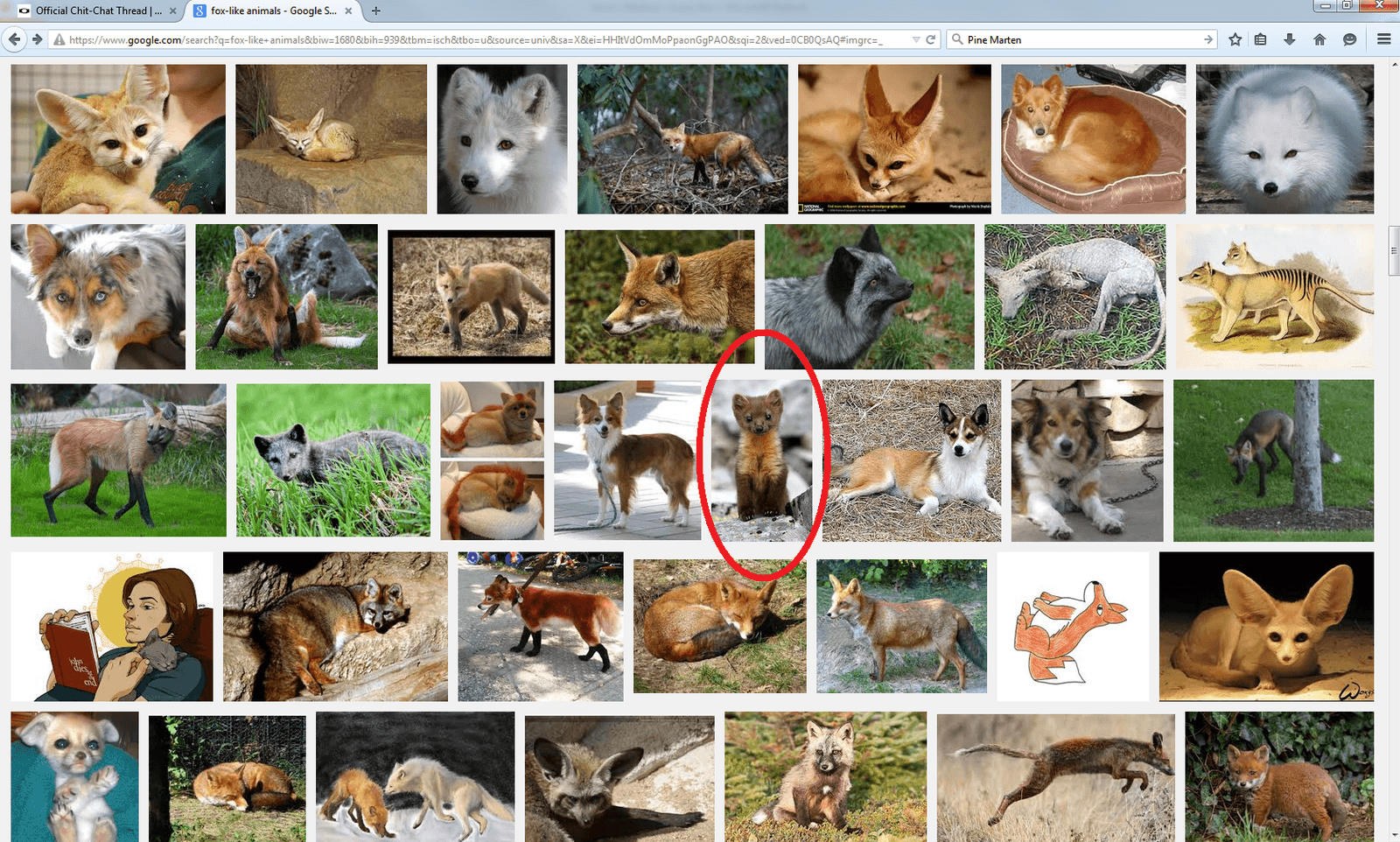I didn't know what they were either, just looked like some kinda fox. I googled "fox-like animals" and one of the image results was one of the pics she has hanging. The webpage it was from identified it as a baby pine marten.