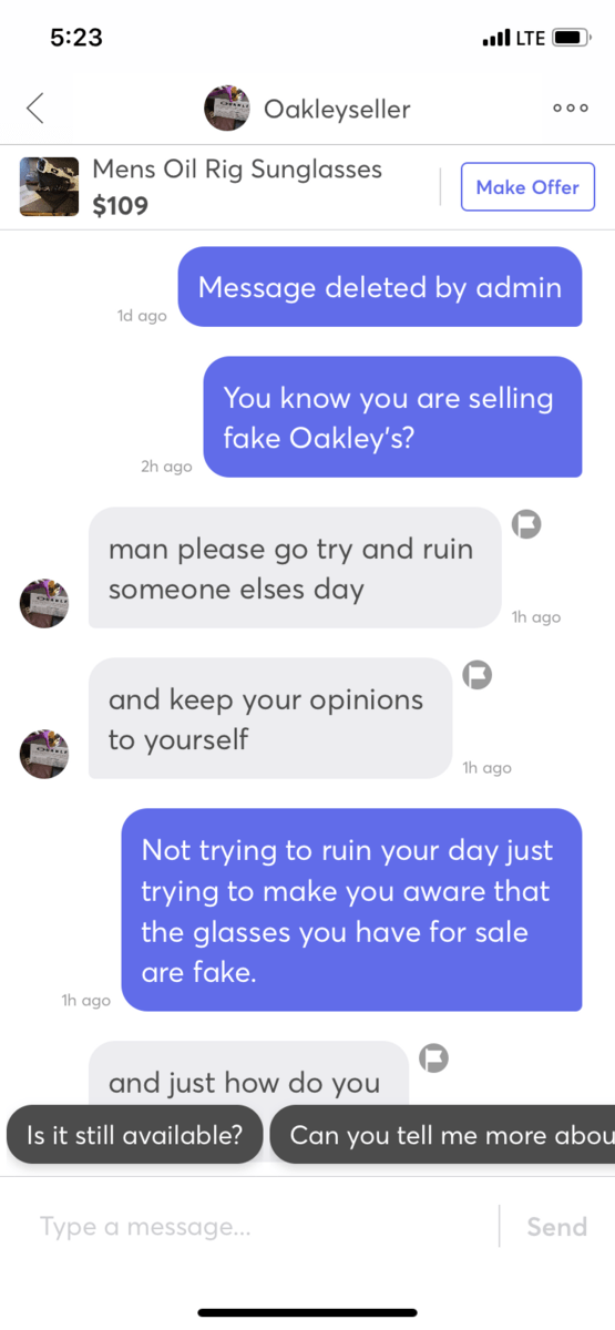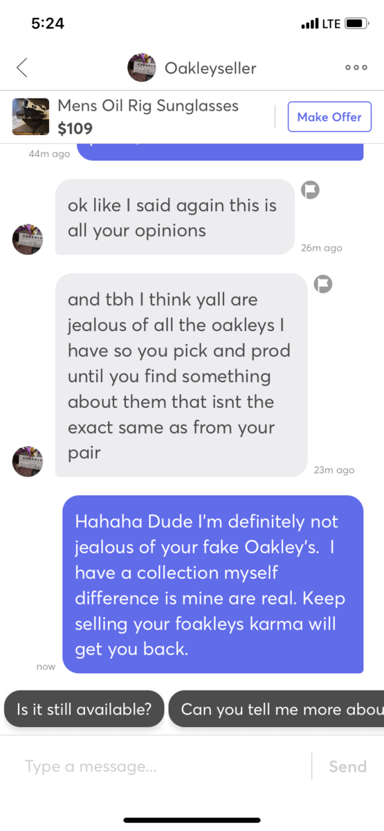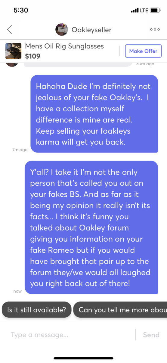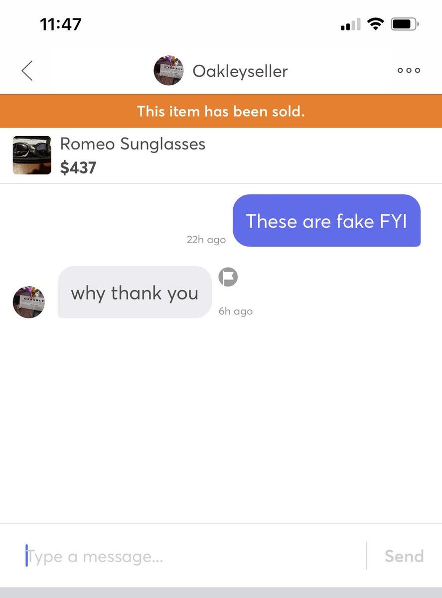 He knows he’s selling fakes and seems to not care. Everyone please report his ass