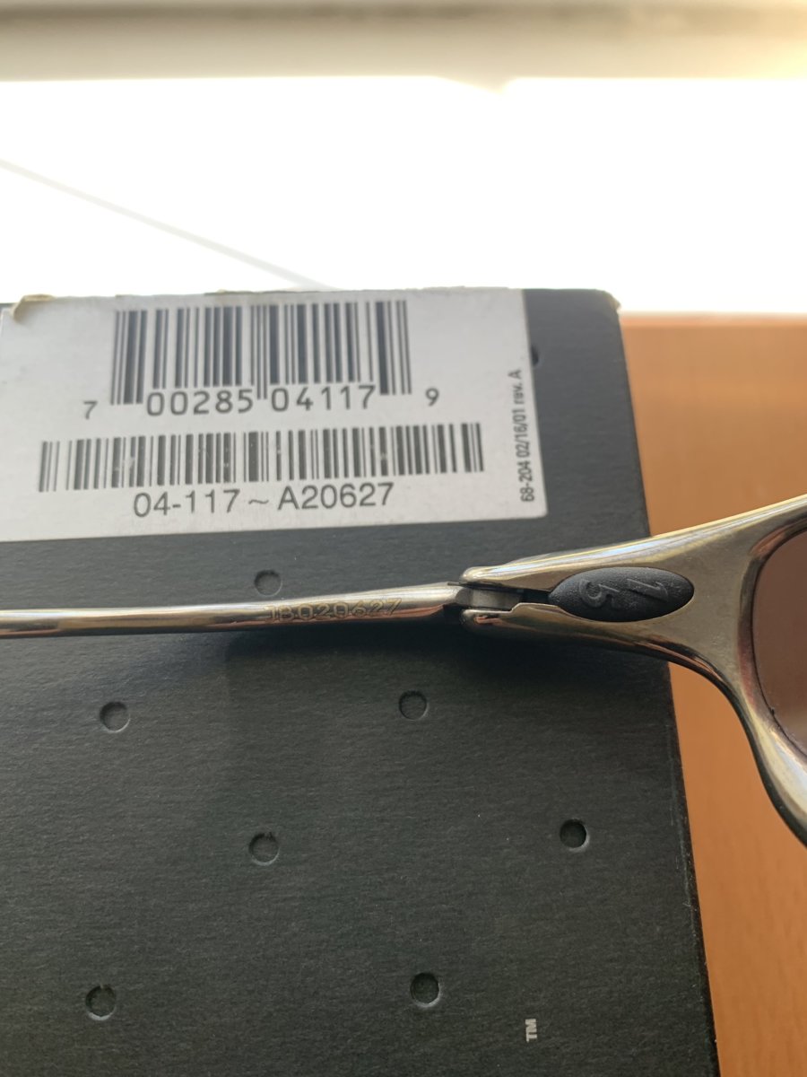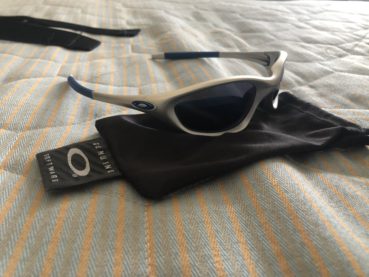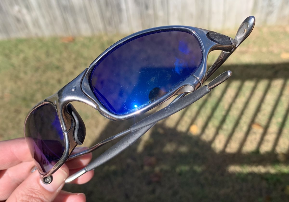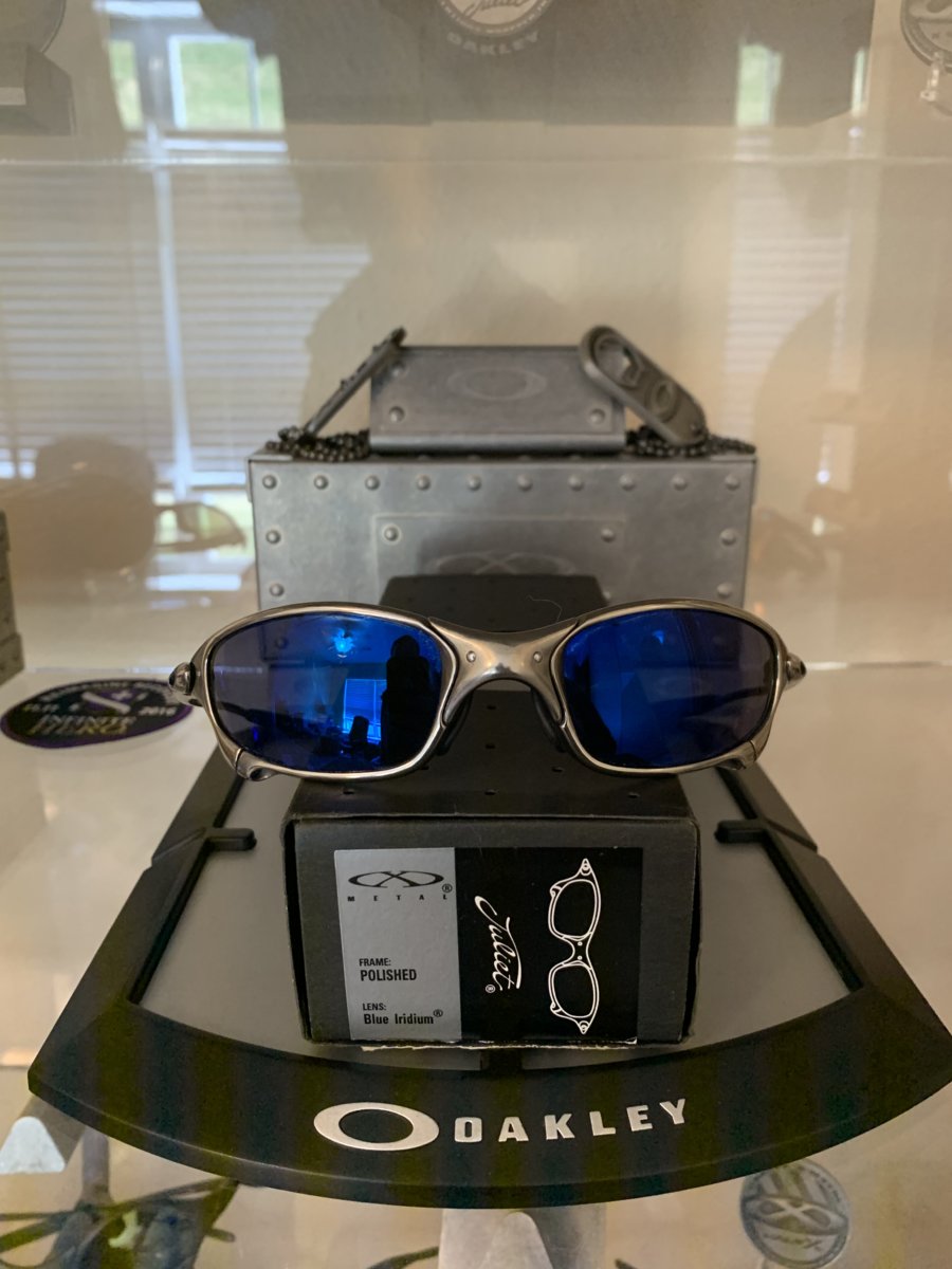 I'm curious on what the value is for a used matching serial Polished Juliet Blue Iridium set. I 'm not selling them but when I was buying them I had a hard time finding previous matching sets sold on the forum to reference.-- (probably my poor search skills). The serials match and I believe they are the original lenses. They are not mint. The frame has some tarnish on the legs but the orbitals and nose finish is clean. The lenses has some minor scratches from looking at them from the outside but they do not impair any vision when wearing. I would not classify it as a beater set but it certainly has been worn and used by it's previous owner. Nose bridge is tight.