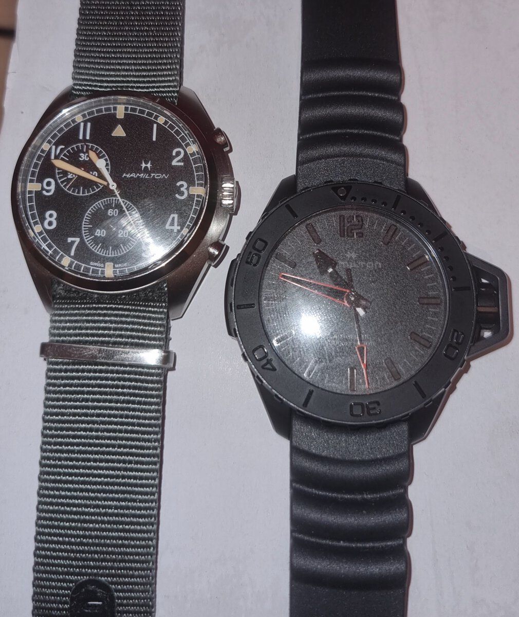 The gold one is the Elipsa; about 50 years old. The white one is the Khaki Action. A rarity, tank of a watch.