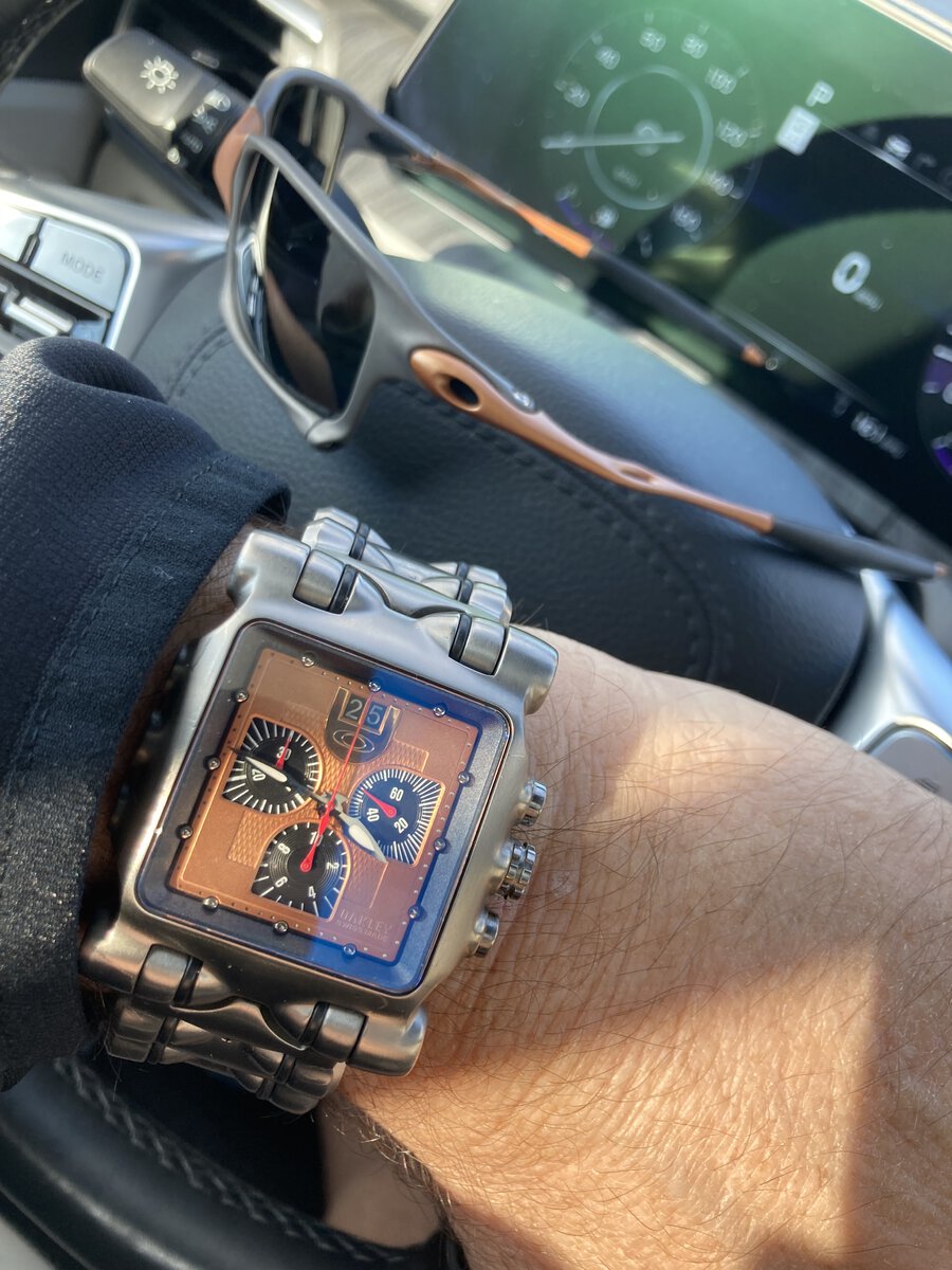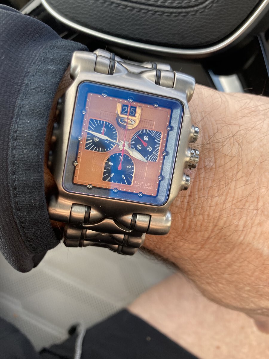 Wearing the 3 dial 6 hand sand color faced Oakley Crankcaee watch on metal ๐ŸŽธ for the win ๐Ÿ† today!!! Have a great day O Family!!!