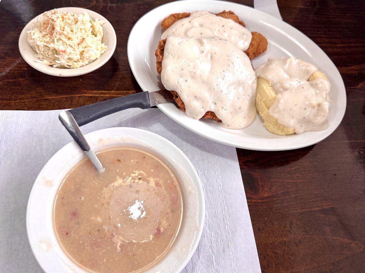 Chicken Fried Chicken, Mashed Potatoes with Chicken Gravy and Ham and Bean Soup and Cole Slaw.